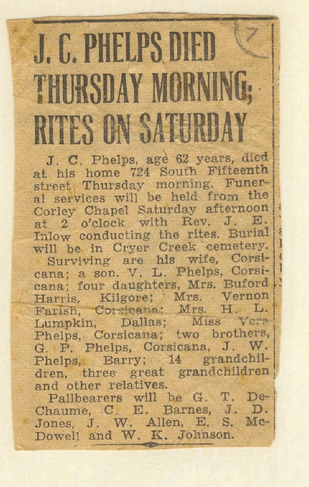 Coffey of Corsicana; great-grandchildren, Damon and Jaren Joles of Augusta, Kan. Arrangements by Corley Funeral Home