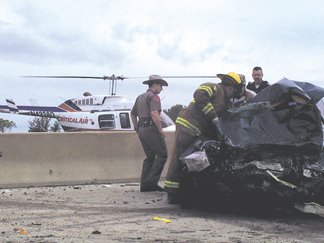As a medical helicopter waits in the background, emergency personnel gather around a crushed 1996 Mitsubishi Galant which suffered damage in a head-on collision on State Highway 31 near Dawson Sunday. The driver of the Galant, Daniel Viljoen of Tyler, was pronounced dead at the scene by Justice of the Peace Vicki Gray. DAILY SUN photo/LOYD COOK