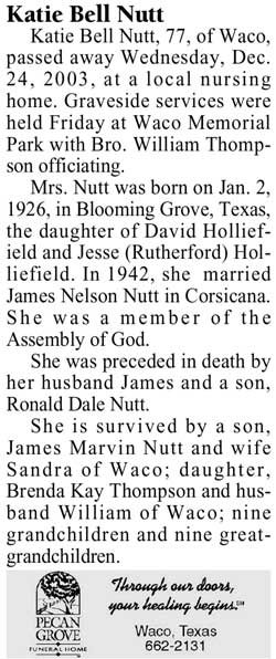 Jan 2, 1926 - Dec 24, 2003 Katie Bell Nutt, 77, of Waco, passed away Wednesday, Dec