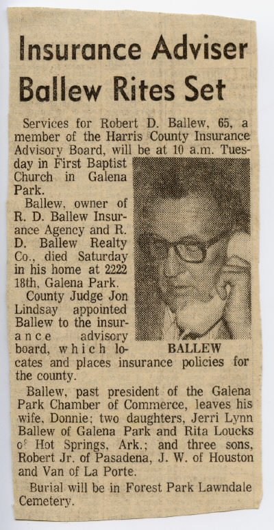 Pasadena, J. W. Ballew, Houston, Van B. Ballew, La Porte; three sisters, Mrs.