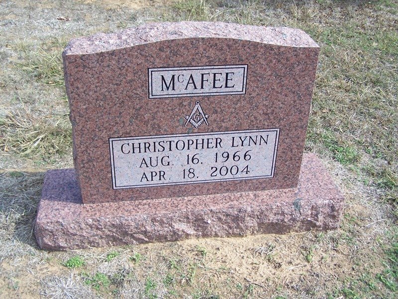McAFEE CHRISTOPHER LYNN born in Dallas, Texas on August 16, 1966, died April 18, 2004. He was a life long resident of Mesquite Texas and an endowed member and past worshipful master of the Mesquite Masonic Lodge #928. Chris was very much loved and will be greatly missed by his family and friends. Chris is survived by his parents Royce and Judy McAfee of Kaufman, County, Sister Kelly McAfee Talton and Brother Kevin McAfee, Uncle Kenneth McAfee of Mesquite Texas, Aunt and Uncle Betty and Bert Potter of Grand Prairie, Texas, several cousins, nephews and nieces. Preceded in death by grandparents, Ray and Lorene McAfee of Aylesworth, Okla. and Earl and Ruth Glenn of Lake Kiowa, Texas. Chris was a 1984 graduate of West Mesquite High and received tow degrees from North Texas University and Eastfield College in Finance and Business. He had his office in Mesquite as a Stockbroker and Independent Insurance agent. Chris fought a long, hard, painful battle with MS. Donations would be accepted in his name to any Multiple Scierosis research dept. or chapter. Masonic Rites and a memorial service will be held on Tuesday, April 20, 2004 at 600 p.m. at Anderson Clayton Funeral Home 1111 Military Pkwy. Mesquite, Texas 972 285-5489