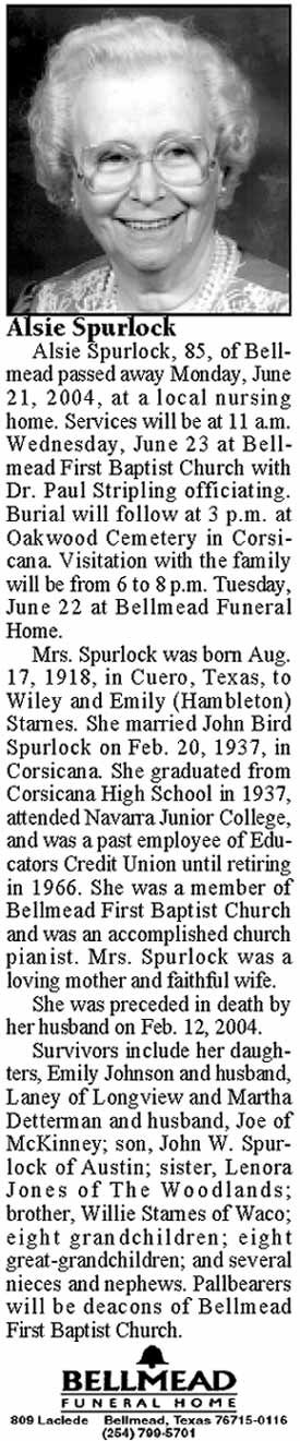 Arrangements by Paschal Funeral Home, Kerens. Notes: - Corsicana Daily Sun - June 13, 2004
