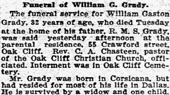 The funeral service for William Gaston Grady, 32 years of age, who died Tuesday at the home of his father, R. M. S. Grady, was said yesterday afternoon at the parental residence, 55 Crawford street, Oak Cliff. Rev.