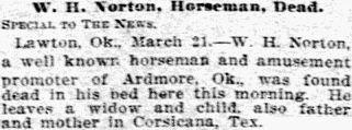 Lawton, Ok., March 21. - W. H. Norton, a well known horseman and amusement promoter of Ardmore, Ok., was found dead in his bed here this morning. He leaves a widow and child, also father and mother in Corsicana, Tex.