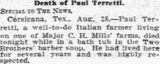 Corsicana, Tex., Aug. 28. - Paul Terretti, a well-to-do Italian farmer living on one of Major C. H. Mills' farms, died tonight while in a bath tub in the Two Brothers' barber shop. He had lived here for several years and was highly respected.