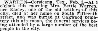 WARREN - Corsicana, Tex., Feb. 3. - At 5 o'clock this morning Mrs. Bettie Warren, nee Easley, one of the old settlers of this city, died at her home on South Fifteenth street, and was buried at Oakwood cemetery this afternoon, the funeral services being attended by a large number of the best people in the city.