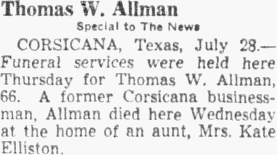Thomas W. Allman Special to the News CORSICANA, Texas, July 28. - Funeral services were held here Thursday for Thomas W. Allman, 66. A former Corsicana businessman, Allman died here Wednesday at the home of an aunt, Mrs. Kate Elliston. Notes: