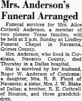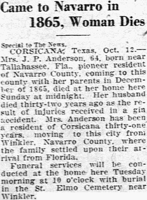 Mrs. Emma Anderson Rites Held at Pursley Special to the News CORSICANA, Texas, April 9. - Mrs. Emma Josephine Anderson, 85, long-time Navarro County resident, died in Sulphur Spring. Funeral services were conducted from the Pursley Baptist Church Tuesday with burial in the Pursley Cemetery. Surviving are three sons, Home O. Anderson, Anahuac; Alton B. Anderson, Pursley, and Oscar S. Anderson, Azle; three daughter, Mrs. A. B. Worsham, Sulphur Springs; Mrs. C. E. Johnson, Houston, and Mrs. Myrtle Rutland, Dallas; brother, Henry Pursley, Pursley; fifteen grandchildren and nine great-grandchildren. Notes: