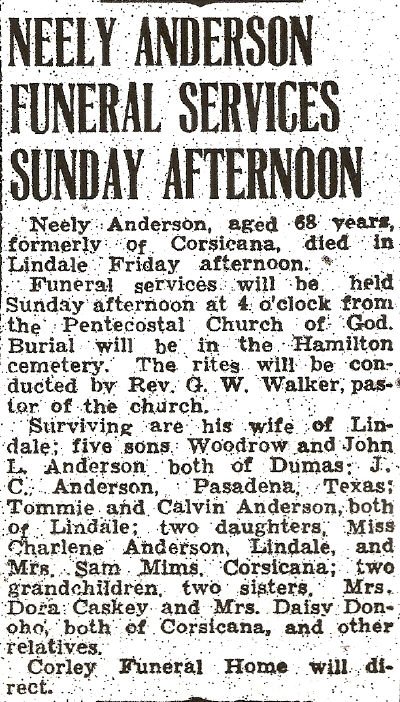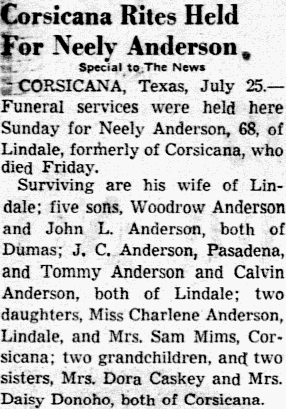 Corsicana Rites Held for Neely Anderson Special to the News CORSICANA, Texas, July 25. - Funeral services were held here Sunday for Neely Anderson, 68, of Lindale, formerly of Corsicana, who died Friday. Surviving are his wife of Lindale; five sons, Woodrow Anderson and John L. Anderson, both of Dumas; J. C. Anderson, Pasadena, and Tommy Anderson, both of Lindale; two daughters, Miss Charlene Anderson, Lindale, and Mrs. Sam Mims, Corsicana; two grandchildren, and two sisters, Mrs. Dora Caskey and Mrs. Daisy Donoho, born of Corsicana. Notes: