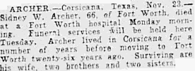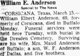 William E. Anderson Special to the News CORSICANA, Texas, March 15. - William Elbert Anderson, 69, formerly of Corsicana, died in Buffalo Monday. Funeral services were held here Tuesday, with burial in the Dresden Cemetery. Surviving are his wife, Mrs. Maud Anderson of Buffalo; a son, W. F. Anderson of Dallas, and five brothers. Notes: