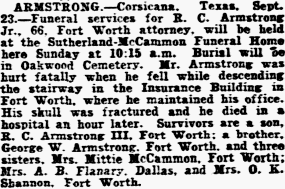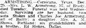 Mrs. L. W. Armstrong, 57, of Brady, died Tuesday. Funeral was held Wednesday. Surviving are her husband, two sons, Stokes and Charles Joe Armstrong, all of Barry; a daughter, Mrs. A. M. Shows, Richland; six grandchildren and a brother, Ed Stokes, Dallas.