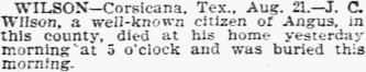 Tex., Aug. 21. - J. C. Wilson, a well-known citizen of Angus, in the county, died at his home yesterday morning at 5 o'clock and was buried this morning.