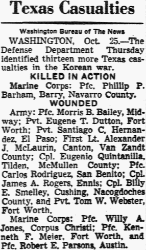 Marine, was killed in action in Korea Oct. 20, according to a message