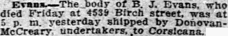 Evans - The body of B. J. Evans, who died Friday at 4539 Birch street, was at 5 p. m. yesterday shipped by Donovan-McCreary undertakers, to Corsicana.