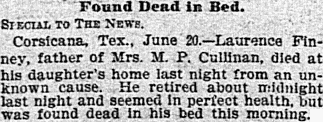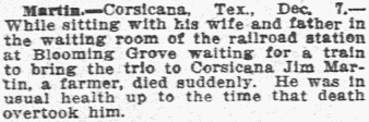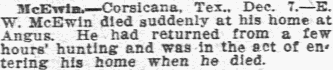 McEwin - Corsicana, Tex., Dec. 7. - E. W. McEwin died suddenly at his home at Angus. He had returned from a few hours' hunting and was in the act of