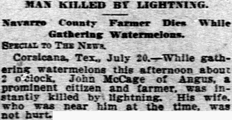 Corsicana, Tex., July 20. - While gathering watermelons this afternoon about 2 o'clock, John McCage of Angus, a prominent citizen and farmer, was