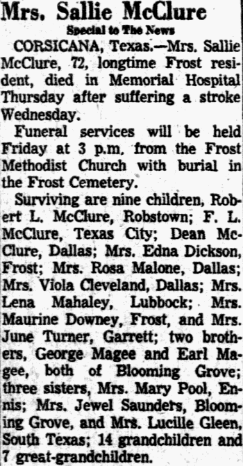 Mrs. Sallie McClure, 72, longtime Frost resident, died in Memorial Hospital Thursday after suffering a stroke Wednesday.