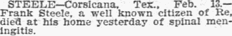 STEELE - Corsicana, Tex., Feb. 13 - Frank Steele, a well known citizen of Re, died at his home yesterday of spinal