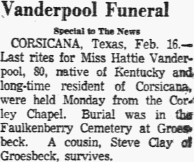 Vanderpool Funeral Special to The News CORSICANA, Texas, Feb. 16. - Last rites for Miss Hattie Vanderpool, 80, native of Kentucky and long-time resident of Corsicana, were held Monday