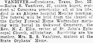 VANDIVER - Corsicana, Tex. Dec. 12. - Rufus S. Vandiver, 37, cotton buyer, resident of Corsicana practically all of his life, died in an Abilene