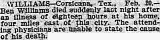 WILLIAMS - Corsicana, Tex., Feb 20. - Ben Williams died suddenly last night after an illness of eighteen hours at his home, four miles east of this city. The attending physicians are unable to state the cause of his death.