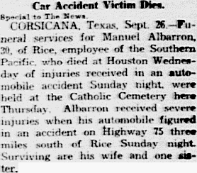 Texas. Sept 26. - Funeral services for Manuel Albarron, 30, of Rice,