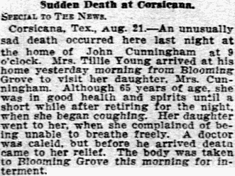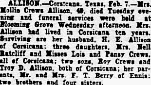 Navarro County, died at her home in Kerens. Funeral services were held