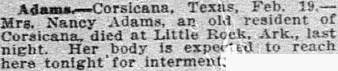 Adams - Corsicana, Texas, Feb. 19. - Mrs. Nancy Adams, an old resident of Corsicana, died at Little Rock, Ark., last night. Her body is expected to