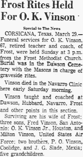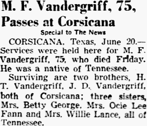 M. F. Vandergriff, 75, Passes at Corsicana Special to The News CORSICANA. Texas, June 20. - Services were held here for M. F. Vandergriff, 75, who died Friday. He was a native of Tennessee. Surviving are two brother, H. T. Vandergriff, J. D. Vandergriff, both of Corsicana; three sisters, Mrs. Betty George, Mrs. Ocie Lee Fann