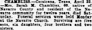 April 23, 1935 CHAMBLISS - Corsicana, Texas. April 22. - Mrs. Sarah M. Chambliss, 60, native of Navarro County and resident of the Navarro community for twelve years died Saturday. Funeral services were held Monday at the Navarro Church. Surviving are five son, six daughters, four brothers and two sisters.