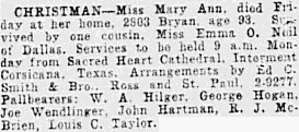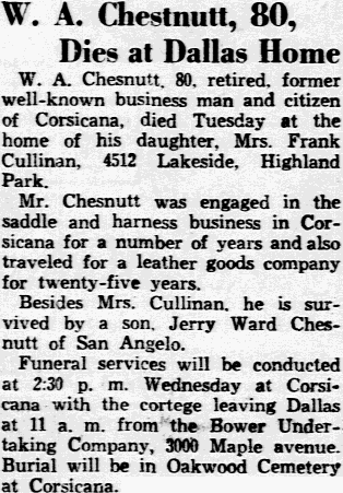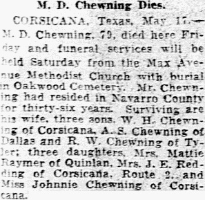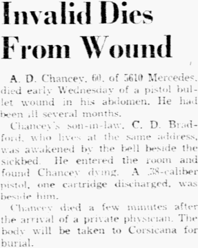 Jan 3, 1940, Dallas, Texas Invalid Dies From Wound A. D. Chancey, 60, of 5610 Mercedes, died early Wednesday of a pistol bullet wound in his abdomen. He had been all several months. Chancey's son-in-law, C. D. Bradford, who lives at the same address, was awakened by the bell beside the sickbed. He entered the room and found Chancey dying. A .38-caliber pistol, one cartridge discharged, was beside him. Chancey died a few minutes after the arrival of a private physician. The body will be taken to Corsicana for burial.