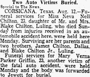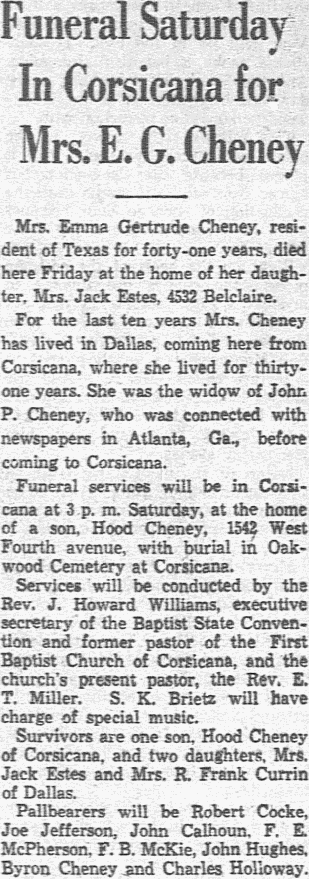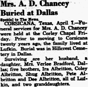 Apr 7, 1939 Mrs. A. D. Chancey Buried at Dallas Special to The News CORSICANA, Texas. April 7. - Funeral services for Mrs. A. D. Chancey were held at the Corley Chapel Friday. Prior to moving to Corsicana twenty years ago, the family lived at Lufkin. Burial was in Hillcrest Cemetery in Dallas. Surviving are her husband, a daughter, Mrs. Verlee Bradford, Dallas; five brothers, Ira Albritton, Coley Albritton, Shug Albritton, Pete Albritton and Dee Albritton, all of Lufkin, and two granddaughters. Notes: