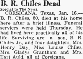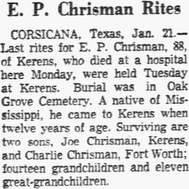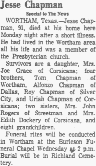 Mar 10, 1954, Wortham, Texas Jesse Chapman Special to The News WORTHAM, Texas. - Jesse Chapman, 91, died at his home here Monday night after a short illness. He had lived in the Wortham area all his life and was a member of the Presbyterian church. Survivors are a daughter, Mrs. Joe Grace of Corsicana; four brothers, Tom Chapman of Wortham, Alfonzo Chapman of Dallas, Roy Chapman of Silver City, and Uriah Chapman of Corsicana; two sisters, Mrs. John Rogers of Streetman and Mrs. Edith Dockery of Corsicana, and eight grandchildren. Funeral rites will be conducted in Wortham at the Burleson Funeral Chapel Wednesday at 2 p.m. Burial will be in Richland Cemetery. Notes: