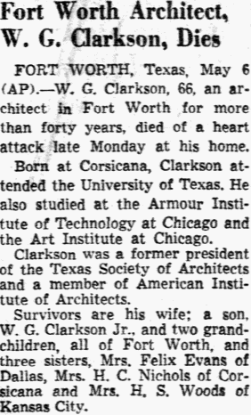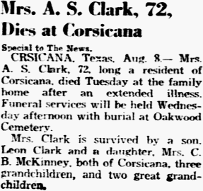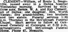Oct 22, 1942, Dallas, Texas CLEMENT - William Clement, of Route 1, Seagoville, passed away in a Dallas hospital Wednesday morning. Survived by wife; three sons, Bernie, W. A. and Ray Clement, all of Dallas; one daughter, Mrs. Worth Yantes; five grandchildren, two brothers and two sisters. Funeral services 1:30 p.m. Thursday in the McCullough Funeral Chapel. Short service to follow at Oakwood Cemetery at Corsicana at 3:30 p.m. Arrangements with McCullough Funeral Home.