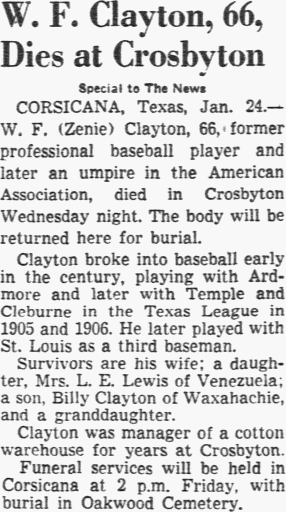 Jan 24, 1952 W. F. Clayton, 66, Dies at Crosbyton Special to The News CORSICANA, Texas, Jan. 24 - W. F. (Zenie) Clayton, 66, former professional baseball player and later an umpire in the American Association, died in Crosbyton Wednesday night. The body will be returned here for burial. Clayton broke into baseball early in the century, playing with Ardmore and later with Temple and Cleburne in the Texas League in 1905 and 1906. He later played with St. Louis as a third baseman. Survivors are his wife; a daughter, Mrs. L. E. Lewis of Venezuela; a son, Billy Clayton of Waxahachie, and a granddaughter. Clayton was manager of a cotton warehouse for years at Crosbyton. Funeral services will be held in Corsicana at 2 p.m. Friday, with burial in Oakwood Cemetery. Notes: