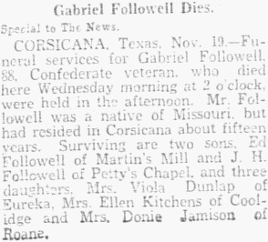 November 19, 1930 Gabriel Followell Dies Special to The News CORSICANA, Texas. Nov. 19 - Funeral services for Gabriel Followell, 88, Confederate veteran, who died here Wednesday morning at 2 o'clock, were held in the afternoon. Mr. Followell was a native of Missouri, but had resided in Corsicana about fifteen years. Surviving are two sons, Ed Followell of Martin's Mill and J. H. Followell of Petty's Chapel, and three daughters, Mrs. Viola Dunlap of Eureka, Mrs. Ellen Kitchens of Coolidge and Mrs. Donie Jamison of Roane.