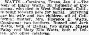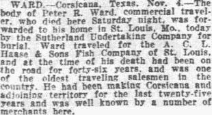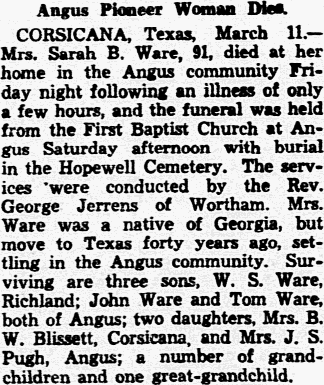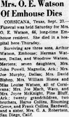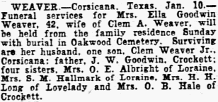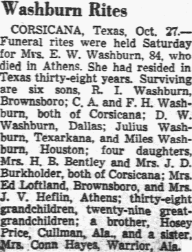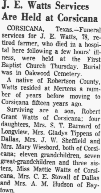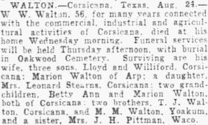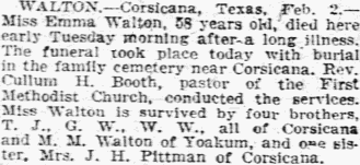 February 2, 1921 WALTON - Corsicana, Texas. Feb. 2 - Miss Emma Walton, 58 years old, died here early Tuesday morning after a long illness. The funeral took place today with burial in the family cemetery near Corsicana. Rev. Cullum H. Booth, pastor of the First Methodist Church, conducted the services. Miss Walton is survived by four brothers, T. J., G. W., W. W. all of Corsicana and M. M. Walton of Yoakum, and one sister, Mrs. J. H. Pittman of Corsicana. Notes: