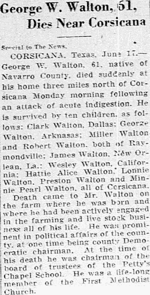 June 17, 1929 George W. Walton, 61, Dies Near Corsicana Special to The News CORSICANA, Texas, June 17. - George W. Walton, 61, native of Navarro County, died suddenly at his home three miles north of Corsicana Monday morning following an attack of acute indigestion. He is survived by ten children as follows: Clark Walton, Dallas; George Walton, Arkansas; Miller Walton and Robert Walton, both of Raymondville; James Walton, New Orleans, La.; Wesley Walton, California; Hattie Alice Walton, Lonnie Walton, Preston Walton and Minnie Pearl Walton all of Corsicana. Death came to Mr. Walton on the farm where he was born and where he had been actively engaged in the farming and live stock business all of his life. He was prominent in political affairs of the county, at one time being county Democratic chairman. At the time of his death he was chairman of the board of trustees of the Petty's Chapel School. He was a life-long member of the First Methodist Church. Notes:
