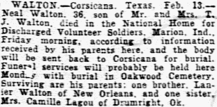 February 13, 1931 WALTON - Corsicana. Texas. Feb. 13 - Neal Walton, 36, son of Mr. and Mrs. T. J. Walton, died in the National Home for Discharged Volunteer Soldiers, Marion, Ind., Friday morning, according to information received by his parents here, and the body will be sent back to Corsicana for burial. Funeral services will probably be held here Monday with burial in Oakwood Cemetery. Surviving are his parents; one brother, Lanier Walton of New Orleans, and one sister, Mrs. Camille Lagou of Drumright, Ok. Notes: