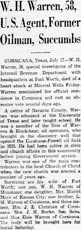 Rev. A. B. Welch, Retired Cleric, Dies in Corsicana The Rev. A. B. Welch, 82, of 1602 West Twelfth, retired Presbyterian minister and resident of Dallas for the last four years, died at the home of his daughter, Miss Rachael Welch, in Corsicana Wednesday after a brief illness. Mr. Welch had been in Corsicana supplying the pulpit of the Third Avenue Presbyterian Church for the last two days, and after his services last Sunday had a heart attack. He was confined to bed and had several other attacks, the last of which was fatal Wednesday evening. Minister for Fifty-Five Years. A native of Illinois, Mr. Welch had been a Presbyterian minister for the last fifty-five years, and had been pastor of the church at Lodonia for twenty-four years up to the time of his retirement after which he moved to Dallas to make his home with a daughter, Mrs. R. F. Butts. Previously he had held several pastorates in Illinois. During his ministry he served as moderator of Presbyteries and synods in which he was located. Funeral Awaits Relatives. He is survived by his wife, three daughters, Miss Rachael Welch, Corsicana; Mrs. Charles V. Moore, Welsh, La.; Mrs. R. F. Butts, Dallas; four sons, Herbert Welch, Pasadena, Calif.; Norris Welch, Norfolk, Va.; Earl Welch, Riverside, Calif.; Howard Welch, Minerva, Ohio; sixteen grandchildren and seven great-grandchildren. Funeral services are pending the arrival of out-of-town relatives. Burial will be in Restland Memorial Park.