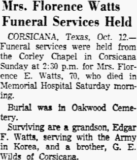 September 16, 1927 WEBB - Corsicana, Texas, Sept. 16. - Mrs. Horton Webb, formerly Miss Florence Rogers of Corsicana, died at her home in Houston and will be buried in Corsicana Saturday, according to information received by Mrs. Andy Autrey Thursday. The funeral will be held with burial in Oakwood Cemetery. Mrs. Webb is survived by her husband, her parents, Mr. and Mrs. S. J. Rogers; two sisters, Mrs. J. W. Wiley and Mrs. Victor Whitmore, all of Houston.
