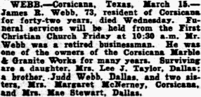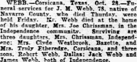 October 28, 1938 WEBB - Corsicana, Texas. Oct. 28. - Funeral services for J. M. Webb, 78, native of Navarro County, who died Thursday, were held Friday. Mr. Webb died at the home of his daughter, Mrs. Joe Chrissman, in the Independence community. Surviving are three daughters, Mrs. Chrissman, Independence; Mrs. Clyde Westbrook, Bazette, and Mrs. Truly Etheredge, Corsicana, and three sons, Robert Webb, Dallas; Jack Webb and James Webb, both of Independence. Notes: