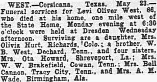 May 23, 1934 WEST - Corsicana, Texas, May 23. - Funeral services for Levi Oliver West, 66, who died at his home, one mile west of the State Home, Monday evening at 6:30 o'clock were held at Dresden Wednesday afternoon. Surviving are a daughter, Mrs. Olivia Hurt, Richards, Colo.; a brother, W. B. West, Dechard, Tenn., and four sisters, Mrs. Ota Howard, Shreveport, La.; Mrs. W. W. Brakefield, Cowan, Tenn.; Mrs. Bell Cannon, Tracy City, Tenn., and Mrs. A. M. Wade, Birmingham, Ala. Notes: