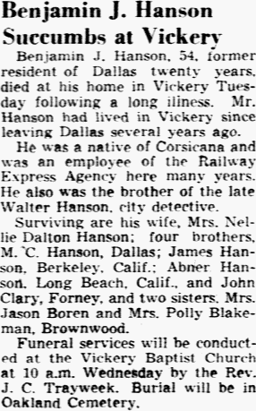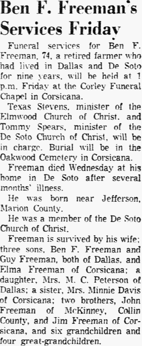Freeman is survived by his wife; three sons, Ben F. Freeman and Guy Freeman, both of Dallas, and Elma Freeman of Corsicana; a daughter, Mrs. M. C. Peterson of Dallas; a sister, Mrs. Minnie Davis of Corsicana; two brothers, John Freeman of McKinney, Collin County, and Jim Freeman of Corsicana, and six grandchildren and four great-grandchildren.