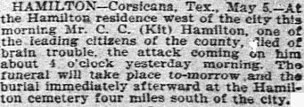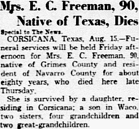 CORSICANA, Texas - August 15, 1935 Funeral services will be held Friday afternoon for Mrs. E. C. Freeman, 90, native of Grimes County and resident of Navarro County for about eighty years, who died here late Thursday.