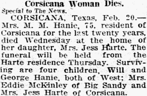 Surviving are three daughters, Mrs. Lucille Snelling, Frost; Mrs. Bessie Malone, Hillsboro, and Mrs. O. W. French, Cleburne; six sons, Jack and Wiley Harrington, both of Frost; Lonnie, Elbert and Ray Harrington, all of Houston, and Tommie Harrington, Goose Creek; three brothers, Jim and W. H. McClure, both of Frost, and George McClure, Route 5, Dallas; and a sister, Mrs. Jim Bonner, Corsicana.