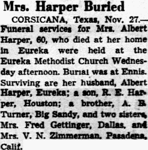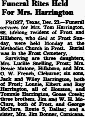 FROST, Texas, Dec. 23. Funeral services for Mrs. Tom Harrington, 68, lifelong resident of Frost and Hillsboro, who died at Frost Sunday, were held Monday at the Methodist Church in Frost. Burial was in the Frost Cemetery.