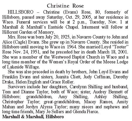 HILLSBORO - Christine (Evans) Rose, 80, formerly of Hillsboro, passed away Saturday, Oct. 29, 2005, at her residence in Waco. Funeral services will be at 2 p.m., Tuesday, Nov 1, at Marshall & Marshall's Eastside Chapel.