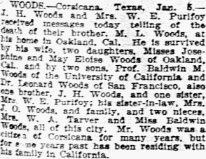 WOODS - Corsicana, Texas, Jan. 6 - J. H. Woods and Mrs. W. E. Purifoy received messages today telling of the death of their brother, M. L. Woods, at his home in Oakland, Cal. He is survived by his wife, two daughters, Misses Josephine and May Eloise Woods of Oakland, Cal., and by two sons, Prof. Baldwin M. Woods of the University of California and Dr. Leonard Woods of San Francisco, also one brother, J. H. Woods, and one sister, Mrs. W. E. Purifoy; his sister-in-law, Mrs. J. O. Woods, and family, and two nieces, Mrs. W. A.
