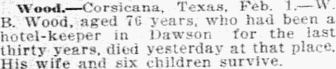 Wood - Corsicana, Texas. Feb. 1. - W. B. Wood, aged 76 years, who had been a hotel-keeper in Dawson for the last thirty years, died yesterday at that place. His wife and six children survive.